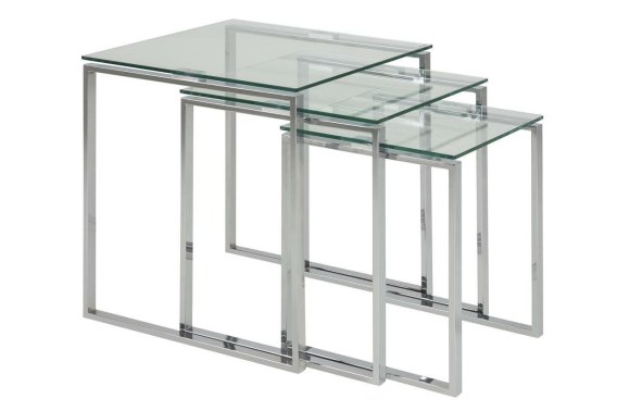 Nowoczesny zestaw stolików Katrine to trzy stoliki o różnych wielkościach. Ponadczasowe połączenie chromu ze szkłem tworzy ciekawą kompozycję. Szklane kwadratowe blaty stolików o grubości 8 mm są zrobione z hartowanego szkła. Metalowa, chromowana podstawa stolików wykończona została na wysoki połysk. Wymiary stolików (cm): 50x50x55; 43x43x50; 36x36x45
